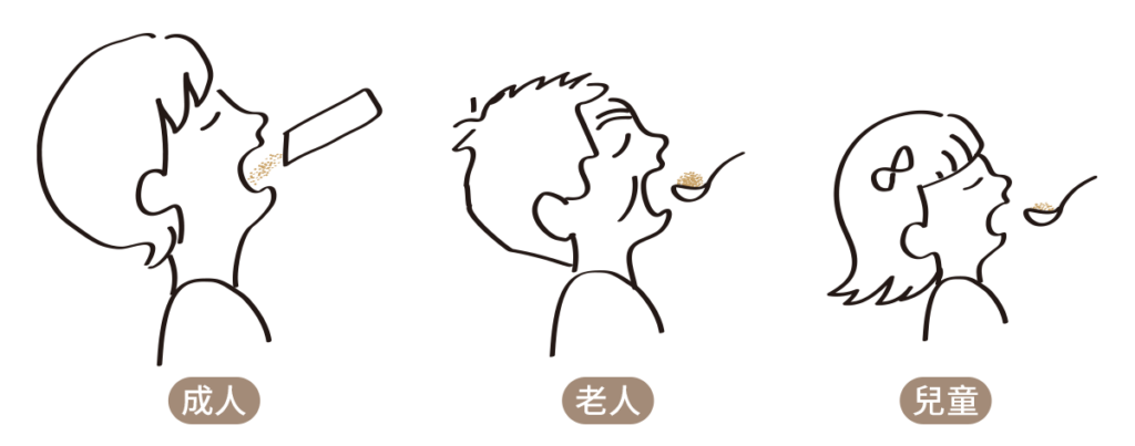 成人直接倒入嘴巴含在嘴巴裡慢慢融化吞下,老人小孩可以倒在湯匙上入口,也可使用少量的開水沖泡飲用