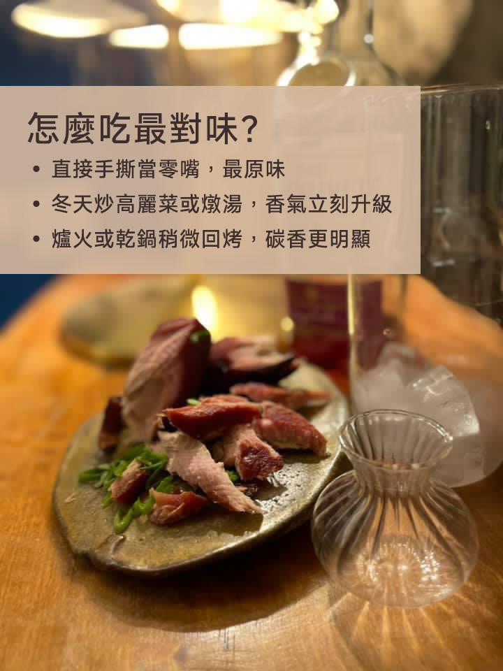 ✔ 100% 無添加|沒有糖、沒有防腐劑、沒有人工香料 ✔ 手撕口感|纖維細緻、不死鹹、不乾硬 ✔ 碳火煙燻|自然炭香,市面少見的島嶼風味 ✔ 多種吃法|直接吃、配酒、炒高麗菜、煮湯、炭火回烤都好吃 ✔ 產地直送|綠島製作,非工廠大量生產
